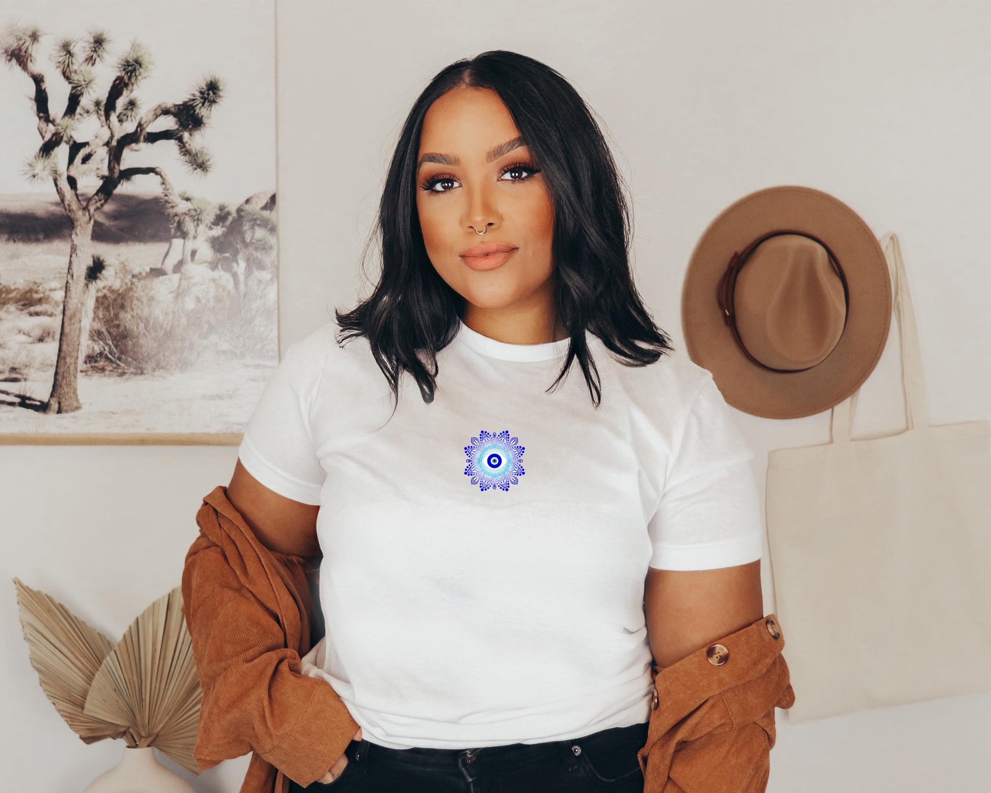 Bella Canvas Unisex White T-Shirt with small evil eye print on center chest.