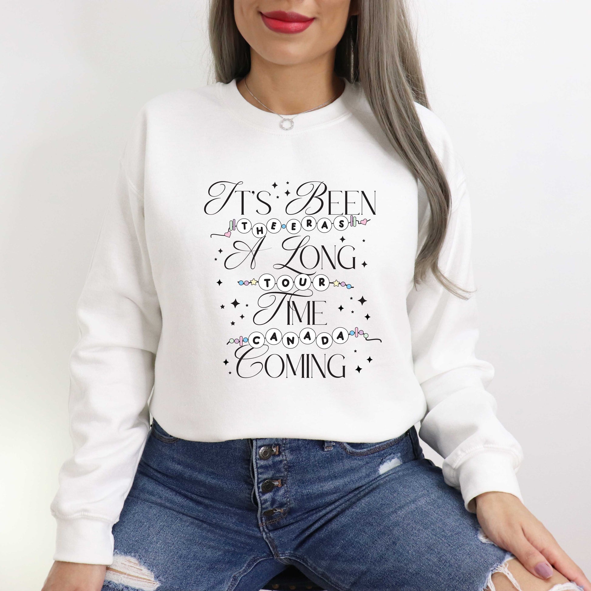 Swifties, we waited, we manifested, and it’s finally here! Celebrate Taylor Swift’s Canadian Eras Tour stops with this dreamy tribute tee that says what we’ve all been screaming since The Eras Tour started—“It’s been a long time coming.” Designed with a mix of elegant fonts, pastel friendship bracelet beads, and playful sparkles, this soft white tee is perfect for tour days, countdowns, or crying in the car (happy tears only).