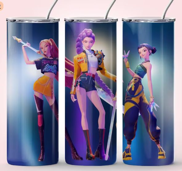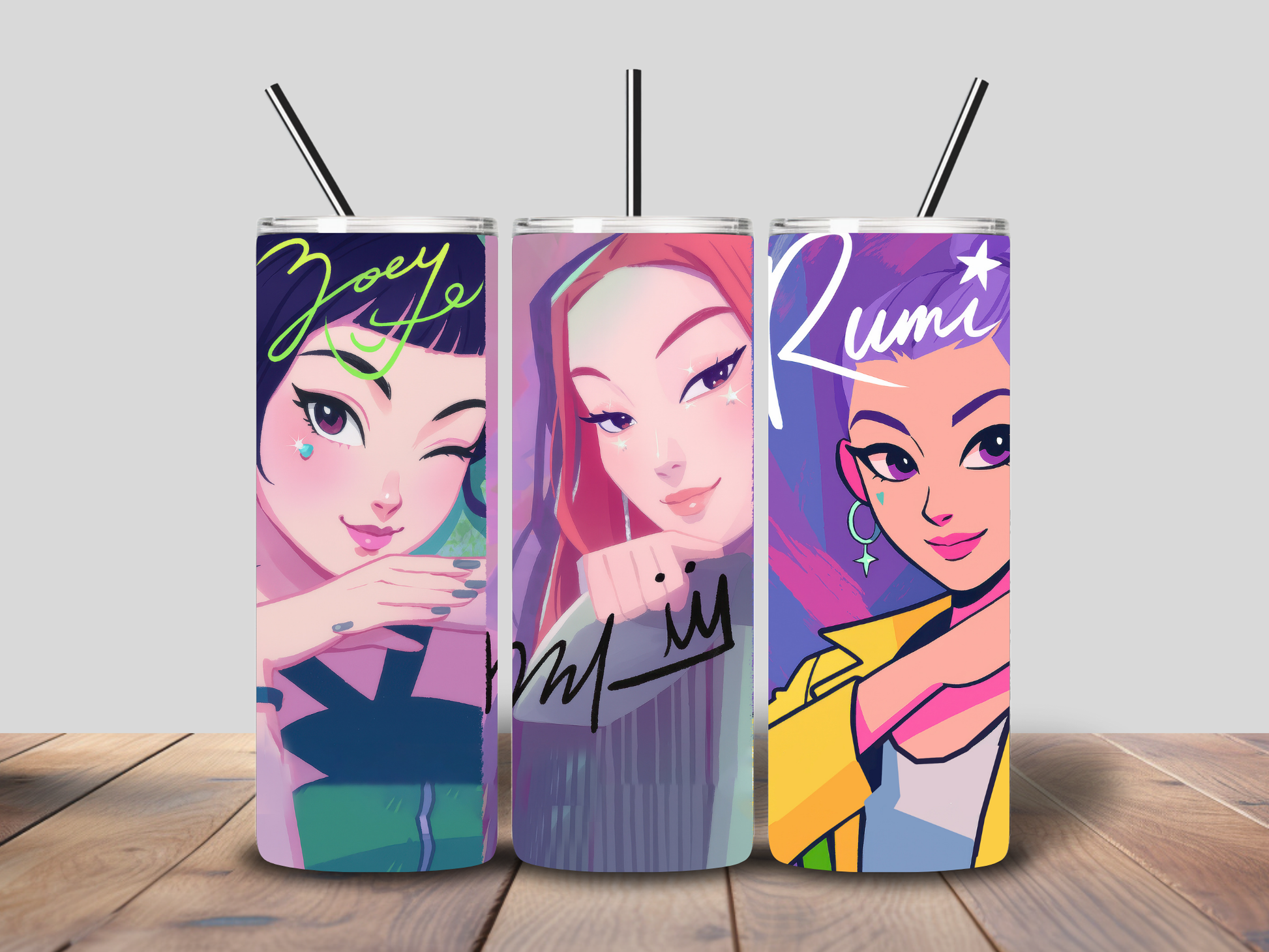 Stay hydrated in true K-pop fan fashion with our K-Pop Demon Hunters 20oz tumblers! Featuring bold sublimated prints of your favorite characters from the hit movie and viral soundtrack, these stainless steel tumblers are equal parts style and function.