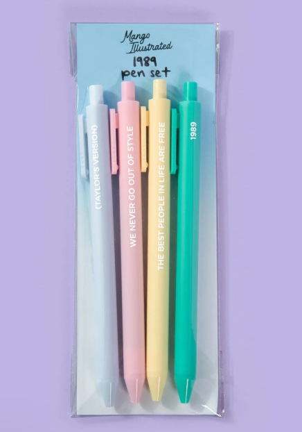 Includes 4 pens with titles 1989, We Never Go Out Of Style, Taylor's Version and The Best People in Life Are Free.