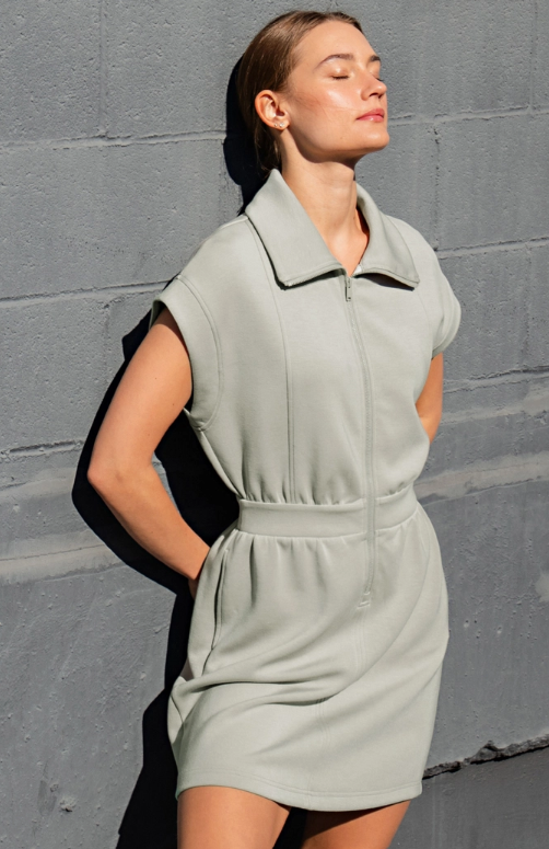 Easy like a deep breath and soft like your favorite secret. The Sage Whisper Zip Dress is the kind of piece you reach for when you want to look pulled together without even trying. Crafted from a silky, four-way stretch scuba knit, this dress smooths and flatters while keeping you light on your feet — literally.