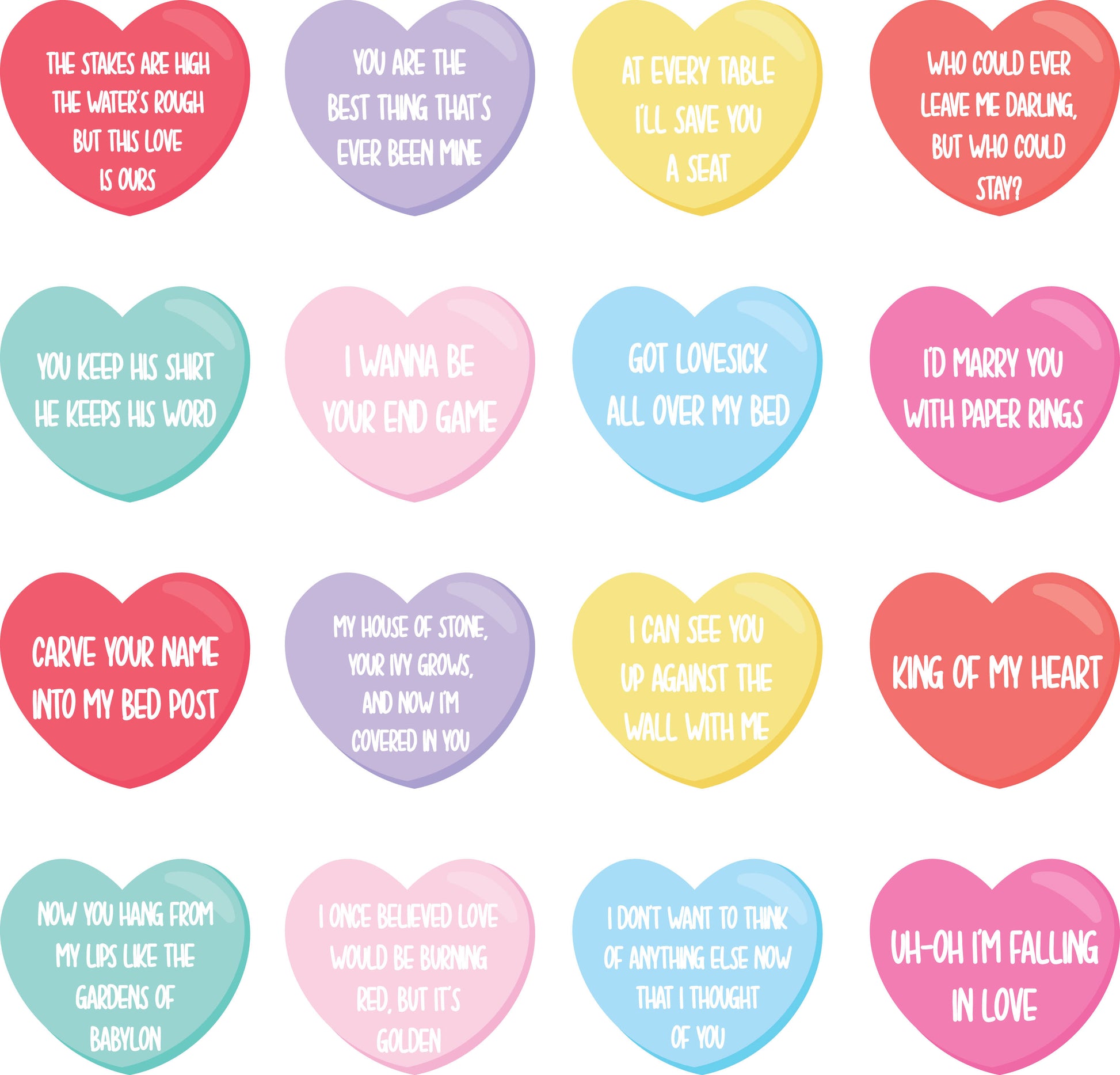 Candy heart designs with Taylor Swift lyrics like: I wanna be your end game, at every table I'll save you a seat, king of my heart and more!