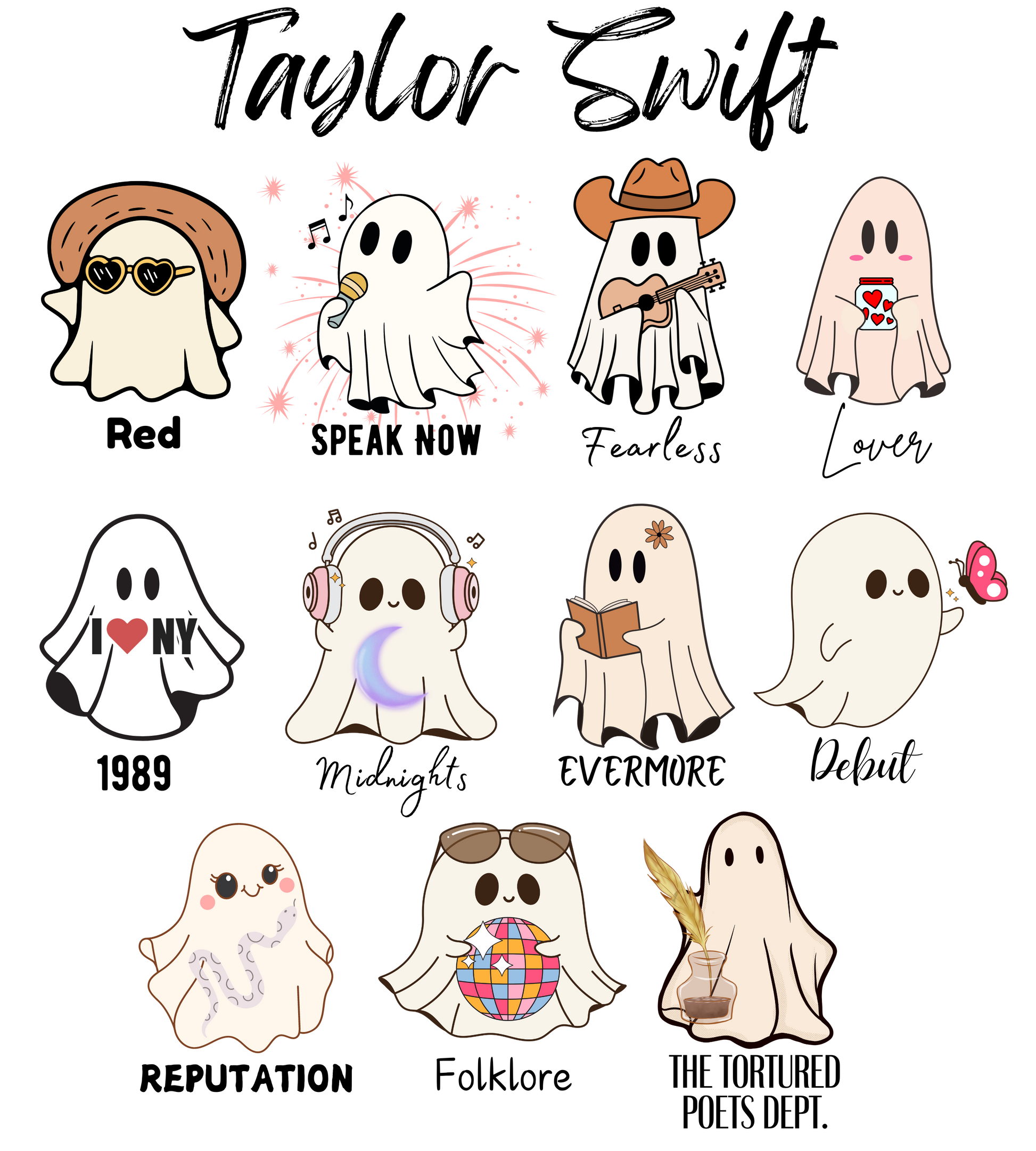 Celebrate Halloween with this Taylor Swift The Eras Tour themed Halloween Ghosts t-shirt glass can representing each era including The Tortured Poets Department.