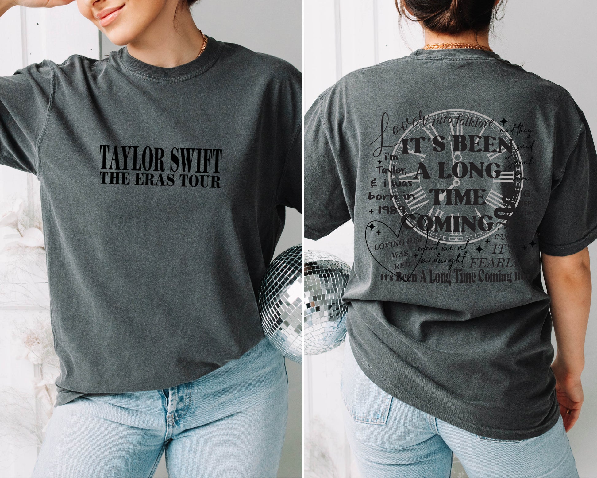 Awesome t-shirt in comfort colors brand in color pepper with Taylor Swift print on front and The Eras Tour intro on the back