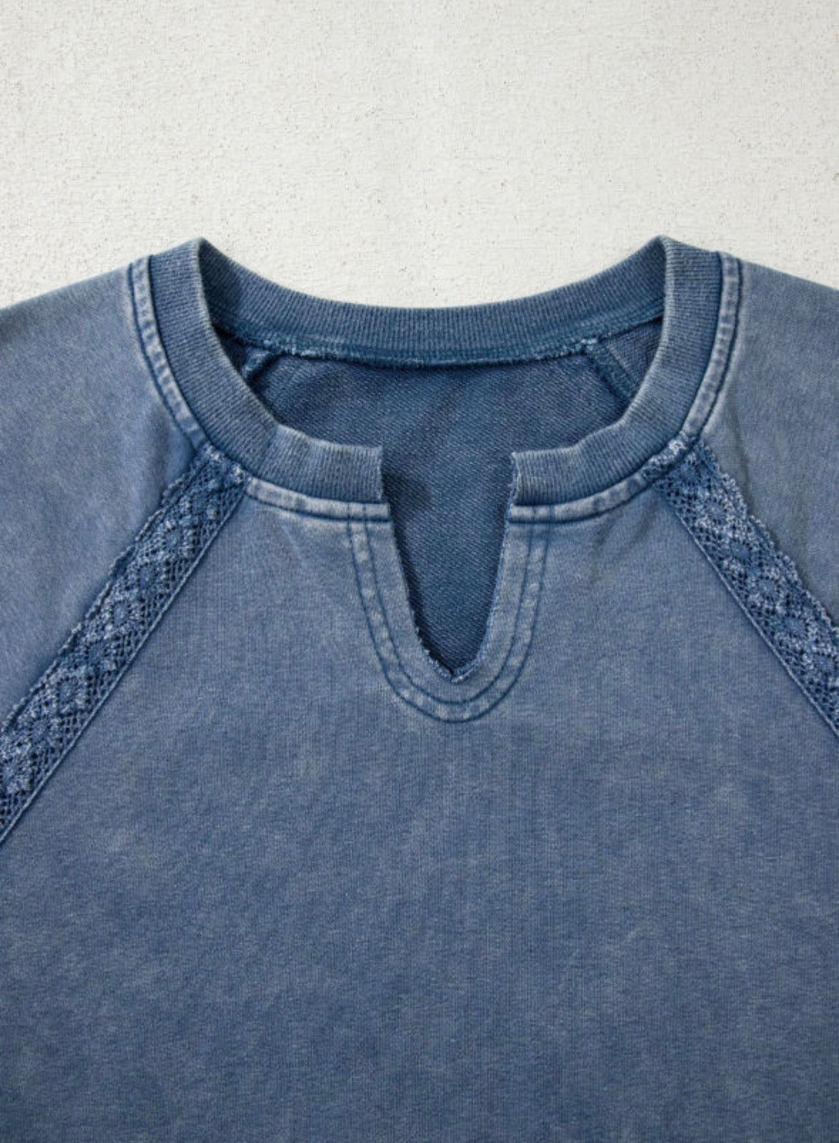 This vintage-wash pullover is made from soft cotton/poly blend with subtle lace trim detailing along the raglan seams and sleeves, adding a feminine touch you don’t see on basic sweatshirts. The split neckline gives it a relaxed, flattering shape that feels effortless while still looking styled.